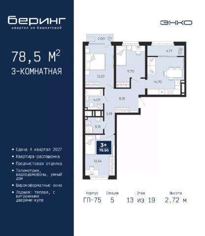 Продаётся квартира площадью 52.4 м2 в жилом комплексе "Айрис". Квартира находится на 13 этаже, жилая площадь квартиры 28.2 м2, площадь просторной кухни — 8.9 м2. Среди особенностей планировки — изолированные комнаты с окнами на одну сторону, 1 совмещённый санузел. Срок сдачи — III кв. 2027 Жилой комплекс "Айрис" — это: - фиджитал-квартал в Тюмени - дома высотой от 7 до 25 этажей - квартиры с системой "Умный дом" - цифровые технологии как элемент благоустройства Окружение В нескольких минутах ходьбы от дома — парк "Комарово" с волейбольной площадкой, открытым кинотеатром, зонами для барбекю и катком. Неподалеку от Airis находится центр иппотерапии, где можно покататься на лошадях и взять уроки верховой езды. На территории Airis появится собственный парк с прогулочными аллеями. Инфраструктура В 5-10 минутах от квартала открыты 2 детских сада и гимназия. На шопинг можно отправиться в торговые комплексы "Колумб" и "Кристалл" — они находятся недалеко от дома. Благоустройство Уютный двор — приватное пространство для жителей. В беседках можно будет почитать книгу в тишине, а в тени деревьев устроиться на пикник. На крыше многоуровневого паркинга будет лаунж-зона с кинотеатром, баскетбольная площадка и воркаут-пространство, где можно позаниматься с виртуальным тренером — достаточно отсканировать код. Лобби Интерьеры лобби выполнены в пастельных тонах с элементами фиджитал-решений. Для отдыха и ожидания гостей создана лаунж-зона. Также есть гостевые санузлы. Колясочные Возвращайтесь налегке после прогулки с малышом — оставить коляску можно в специальном помещении на первом этаже. Кладовые Для сезонных и габаритных вещей предусмотрены отдельные кладовые на цокольном этаже. В каждом помещении уже проведено электричество и выполнена стяжка пола. Паркинг На территории — два многоуровневых наземных паркинга. Один из них примыкает к домам — из него можно напрямую пройти в парадные. Планировки Планировки квартала — от компактной студии до сити-хауса с собственным палисадником — соответствуют любым жизненным сценариям. Можно выбрать квартиры с террасами и готовыми дизайнерскими интерьерами.
