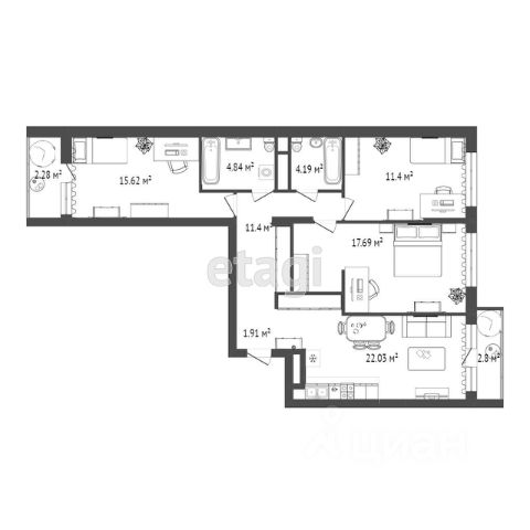 Просторная прихожая квадратной формы, где удобно расположить зоны хранения, ближайшая ко входу комната - кухня-столовая-гостиная почти 21 кв.м с витражным окном и французским балконом, гостевой сан.узел, по левую сторону две детских комнаты почти по 11 кв.м, по правую большая мастер-спальня 16.7 кв.м с витражным окном и ещё одним французским балконом, между комнатами располагается большой приватный сан.узел и гардеробная комната (она может стать так же хозяйственно-постирочной).
