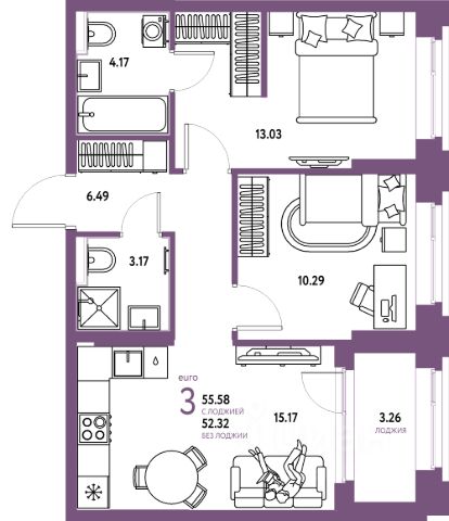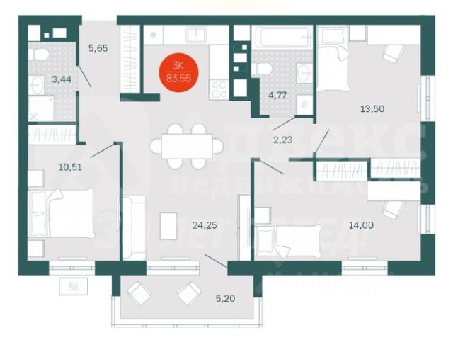 тремя изолированными комнатами правильной формы - 10,5 и 13,5 кв.м. и 14 кв.м., разнесенными по квартире, что обеспечит комфортное личное пространство для детей и родителей. В каждой комнате есть ниша под организацию мест для хранения вещей.