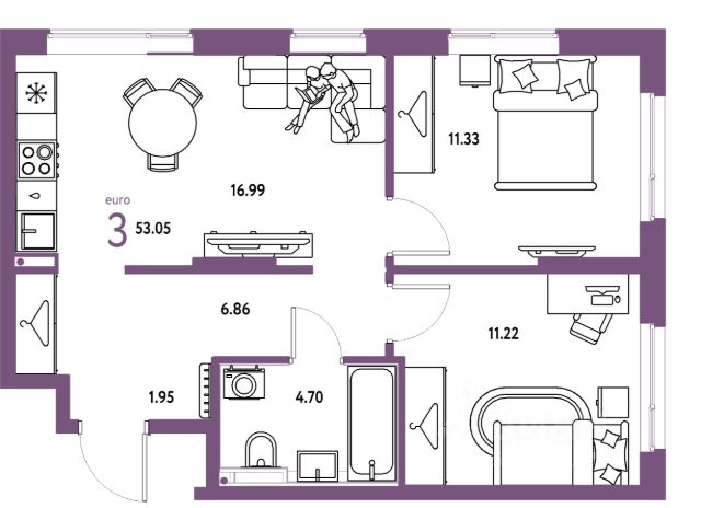 Пол. Цементно-песчаная стяжка, под которой проложен звукоизоляционный материал по принципу "плавающий пол". В мокрых зонах — гидроизоляция.