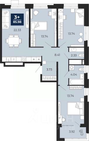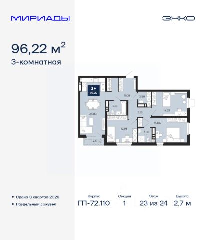 Просторная трехкомнатная квартира в ЖК "Мириады" на 11 этаже. Общая площадь: 85.98 кв.м. Высота потолков 2.7 м. Дом монолитный, черырехподъездный, переменной этажности, от 13 до 16 этажей. Квартира находится во 2-й секции высотой 16 этажей в корпусе ГП-72.106. На этаже 5 квартир. В подъезде 1 пассажирский и 1 грузовой лифт. Окончание строительства - 3 квартал 2028 года. Оформление сделки по договору долевого участия. Вселенная бесконечных историй. Ранее невиданный Тюмени масштаб: территория 240 гектаров и 1 650 000 м² застройки. Мириады это город масштабных перемен и больших возможностей. Город зеленых рощ и зеркальных озер. Город для работы, учебы и развлечений. Город для детей и их родителей. Город для всех и каждого. Проект расположен в районе Мыс рядом с ТРЦ "Тюмень Сити Молл" в границах улицы Тимофея Чаркова, Тобольского тракта и объездной дороги. Срок полного освоения территории - до 2034 года. #Z6ElVI