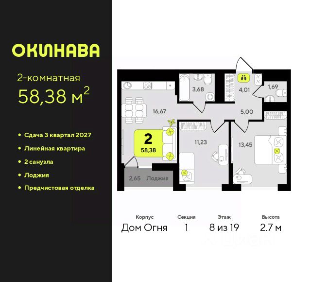 Двухкомнатная квартира от застройщика с предчистовой отделкой в ЖК "Окинава" на 8 этаже. Общая площадь: 58.38 кв.м., жилая: 24.68 кв.м., площадь просторной кухни-столовой: 16.67 кв.м. Комнаты изолированные, все окна выходят на одну сторону. В квартире одна лоджия, один совмещенный и один раздельный санузел. Высота потолков 2.7 м.
