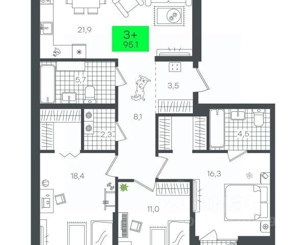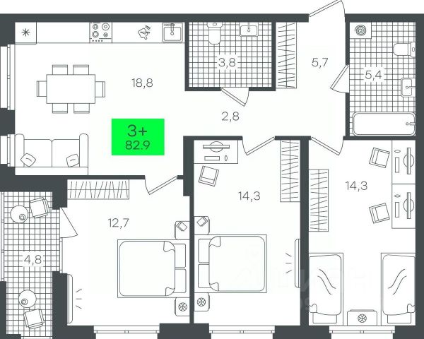 Выделены зоны для работы и отдыха. Просторный санузел позволяет свободно разместить и ванну, и стиральную машину.