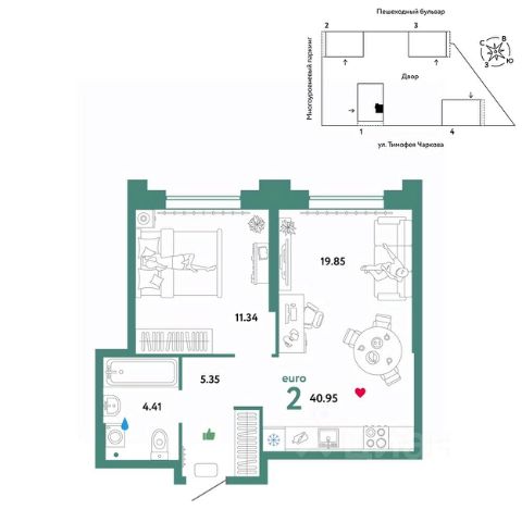 Продаётся квартира площадью 31.66 м2 в жилом комплексе "Смородина". Квартира находится на 1 этаже, жилая площадь квартиры 11.11 м2, площадь просторной кухни — 11.15 м2. Среди особенностей планировки — изолированные комнаты с окнами на одну сторону, 1 совмещённый санузел. Срок сдачи — IV кв. 2026 Жилой комплекс "Смородина" — это: - уютный малоэтажный комплекс в районе ММС - дома высотой 4 этажа - квартиры от студий до семейных вариантов с отапливаемыми лоджиями - экологичные материалы в благоустройстве территории Окружение В 5 минутах ходьбы от проекта — озеро Липовое с песчаным пляжем и лесопарковая зона. Инфраструктура В шаговой доступности есть все для комфортной жизни: школы, детские сады, магазины и аптеки. Рядом с проектом — остановка общественного транспорта. Благоустройство Прямо во дворе — собственные грядки для жителей, где можно выращивать зелень и цветы. Для детей оборудованы детские площадки из натуральных материалов. Лобби Вдохновленные современными тенденциями наши парадные разработаны с акцентом на эстетическую привлекательность и практичность. Использование натуральных материалов и ярких цветовых акцентов создает атмосферу уюта и стиля. Планировки Среди многообразия продуманных планировок есть и уютные студии, и просторные семейные варианты. Во всех квартирах предусмотрены отапливаемые лоджии, где можно устроить зону отдыха или рабочий кабинет.