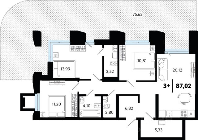 Евротрехкомнатная квартира, в которой есть мастер-спальня с гардеробной и санузлом. Собственная терраса: в летнее время на ней можно организовать зону отдыха, а в зимнее - установить елку. Функциональная кухня-гостиная позволяющая разграничить рабочую зону и зону отдыха.