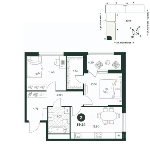 Просторная двухкомнатная квартира с предчистовой отделкой в ЖК "Беринг" на 6 этаже. Общая площадь: 62.65 кв.м., жилая: 25.12 кв.м., площадь просторной кухни-столовой: 18.32 кв.м. Комнаты изолированные, все окна выходят на одну сторону. В квартире одна лоджия, два совмещенных санузла. Высота потолков 2.72 м.