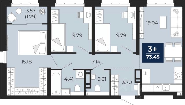 Квартира с кухней-гостиной и тремя спальнями в кварталах "На Минской". Особенности планировки: гардеробная, панорамное остекление, лоджия, предчистовая отделка, мастер-спальня, постирочная.