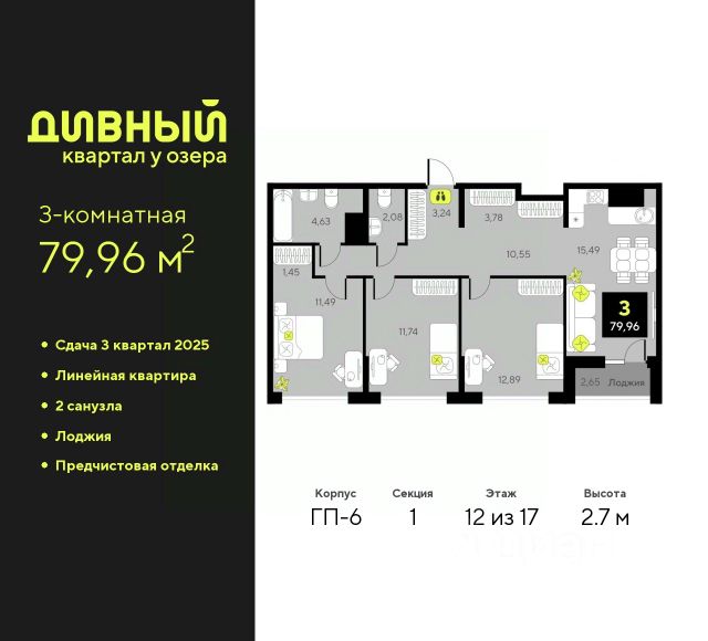 Дом монолитный, многоподъездный, переменной этажности, от 11 до 19 этажей. Квартира находится в 4-й секции высотой 17 этажей в корпусе Дом Воды. На этаже 4 квартиры. В подъезде 1 пассажирский и 1 грузовой лифт. Окончание строительства - 4 квартал 2026 года. Оформление сделки по договору долевого участия.