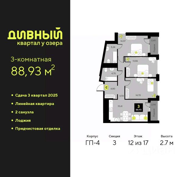 Продаётся 3-комнатная квартира в строящемся доме (ГП-4), срок сдачи: IV-кв. 2027, общей площадью 88.19 кв.м., на 12 этаже. Расположение, транспортная доступность