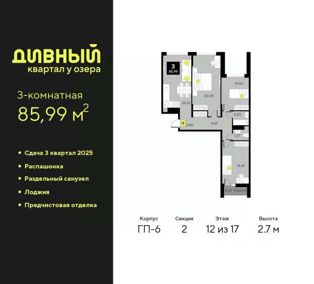 3-комн. квартира от застройщика с предчистовой отделкой в ЖК "Окинава" на 12 этаже. Общая площадь: 85.69 кв.м., жилая: 39.46 кв.м., площадь просторной кухни-столовой: 16.16 кв.м. Квартира - распашонка, без проходных комнат, окна выходят на paзные стороны дома. В квартире один балкон и одна лоджия, два совмещенных санузла. Высота потолков 2.7 м.