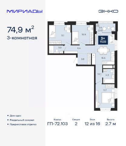 Трехкомнатная квартира от застройщика с предчистовой отделкой в ЖК "Мириады" на 12 этаже. Общая площадь: 113 кв.м. Высота потолков 2.7 м. Дом монолитный, трехподъездный, переменной этажности, от 14 до 16 этажей. Квартира находится в 3-й секции высотой 14 этажей в корпусе ГП-72.103. На этаже 8 квартир. В подъезде 1 пассажирский и 1 грузовой лифт. На сегодняшний день строительство завершено, дом сдан в 4 квартале 2025 года. Оформление сделки по договору купли-продажи. Вселенная бесконечных историй. Ранее невиданный Тюмени масштаб: территория 240 гектаров и 1 650 000 м² застройки. Мириады это город масштабных перемен и больших возможностей. Город зеленых рощ и зеркальных озер. Город для работы, учебы и развлечений. Город для детей и их родителей. Город для всех и каждого. Проект расположен в районе Мыс рядом с ТРЦ "Тюмень Сити Молл" в границах улицы Тимофея Чаркова, Тобольского тракта и объездной дороги. Срок полного освоения территории - до 2034 года. #ZMe2OT