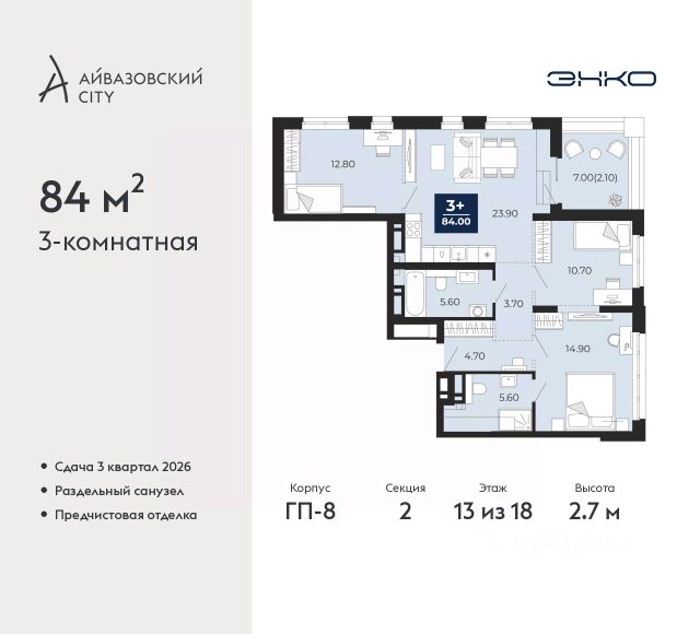 3-комн. квартира от застройщика с предчистовой отделкой в ЖК "Айвазовский City" на 13 этаже. Общая площадь: 84 кв.м., жилая: 38.4 кв.м., площадь просторной кухни-столовой: 23.9 кв.м. Угловая квартира, идеально подойдет любителям тишины и панорамных видов. В квартире одна лоджия, два совмещенных санузла. Терраса представляет собой роскошную зону отдыха для проведение вечеров в кругу семьи и друзей или организация вечеринок. Высота потолков 2.7 м. Дом монолитный, многоподъездный, переменной этажности, от 14 до 24 этажей. Квартира находится во 2-й секции высотой 18 этажей в корпусе ГП-8. На этаже 5 квартир. В подъезде 1 пассажирский и 1 грузовой лифт. Окончание строительства - 3 квартал 2026 года. Оформление сделки по договору долевого участия. Новый жилой район располагается в живописном месте на берегу Туры в центральной части города. Принципиально новое пространство для жизни в центре современного города для тех, чьи мечты сбываются, кто нацелен на постоянный рост, перемены к лучшему для себя и своих близких. Каждая деталь Айвазовский City вдохновляет и заряжает на новые свершения: авторская архитектура, сбалансированная продуманная инфраструктура, дизайнерские дворы со спортивными и детскими площадками, парковые зоны с фонтанами, водный канал, украшающий центральный прогулочный маршрут района и многое другое. В 2019 года проект стал лауреатом престижной премии Urban Awards 2019 в номинации "Лучший строящийся региональный жилой комплекс бизнес-класса". Главная особенность Айвазовский City - соседство разных архитектурных школ в рамках одного дома. Изысканная классика, выразительная эклектика и оригинальный модерн - жить в одном из таких домов настоящий повод для гордости. Айвазовский City это идеальное сочетание комфорта, технологий и развитой инфраструктуры. Вход в подъезд возможен с улицы и со двора. Отправляясь на работу или за покупками, жители могут выйти с внешней стороны дома, а для прогулки с ребенком со стороны двора. Экологически чистые материалы и энергосберегающие технологии, качественное освещение общественных зон, видеонаблюдение по всей территории жилого района (в том числе в подъездах, лифтах и в подземном паркинге), закрытые дворы с доступом только для жителей Айвазовский City. Часть домов в Айвазовский City будут оснащены подземным паркингом. Востребованный в нашем климатическом поясе формат хранения автомобилей защитит собственность владельца в любое время года. Аккредитация в банках: "Сбербанк России", ПАО "Газпромбанк", ПАО Банк "ВТБ", ОАО "Альфа-Банк", ПАО Банк "ФК Открытие" и других. #25FMCi