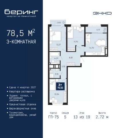 3-комн. квартира от застройщика с предчистовой отделкой в ЖК "Беринг" на 13 этаже. Общая площадь: 70.14 кв.м., жилая: 34.43 кв.м., площадь просторной кухни-столовой: 19.81 кв.м. Квартира угловая, идеально подойдет любителям тишины и панорамных видов. В квартире один балкон, два совмещенных санузла. Высота потолков 2.72 м. Дом монолитный, черырехподъездный, переменной этажности, от 19 до 24 этажей. Квартира находится в 1-й секции высотой 23 этажа в корпусе ГП-76. На этаже 7 квартир. В подъезде 2 пассажирских и 1 грузовой лифт. Окончание строительства - 4 квартал 2027 года. Оформление сделки по договору долевого участия. Подобно знаменитому исследователю, мы чувствуем себя первооткрывателями этой локации. Хотим показать новую суть места, сформировать для вас жизненный опыт, которого ещё не было. Беринг — район зелёного цвета. Беринг — район, который откроется вам с другой стороны. Впечатлит новым уровнем комфорта и качеством жизни. Беринг — открытие на карте города. Первый квартал расположен в районе Тура, в границах улиц: Камчатская Западносибирская Энтузиастов. Вокруг уже есть всё для того, чтобы ежедневная рутина была лишь частью жизни и не доставляла дискомфорта. Школы и детские сады, магазины и аптеки, поликлиника, места для семейного отдыха, пеших и велопрогулок, и даже рыбалки. Масштабное озеленение дворов — визитная карточка ЭНКО и ваш оазис спокойствия, чтобы отвлечься от повседневности. Раскидистые деревья, кустарники, травы и цветы — осталось остановиться, вдохнуть и расслабиться, глядя на эту природную красоту. Стилистика подъездов продолжает концепцию Беринга, вдохновлённого Камчаткой: сдержанный, но при этом впечатляющий дизайн соседствует с удобством и функциональностью. #z6MCoD