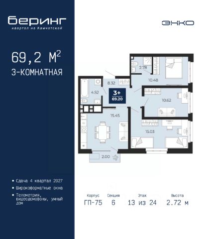 Спешите оформить бронирование по акционной цене, период предложения ограничен! Стоимость квартиры указана со скидкой, ваша экономия составит 500,000 руб. По всем вопросам обращайтесь в офис продаж, наши менеджеры вам все расскажут. Трехкомнатная квартира с предчистовой отделкой в ЖК "Мириады" на 13 этаже. Общая площадь: 105.5 кв.м. Высота потолков 2.7 м. Дом монолитный, трехподъездный, переменной этажности, от 14 до 16 этажей. Квартира находится в 1-й секции высотой 16 этажей в корпусе ГП-72.103. На этаже 8 квартир. В подъезде 1 пассажирский и 1 грузовой лифт. В настоящее время строительство завершено, дом сдан в 4 квартале 2025 года. Оформление сделки по договору купли-продажи. Вселенная бесконечных историй. Ранее невиданный Тюмени масштаб: территория 240 гектаров и 1 650 000 м² застройки. Мириады это город масштабных перемен и больших возможностей. Город зеленых рощ и зеркальных озер. Город для работы, учебы и развлечений. Город для детей и их родителей. Город для всех и каждого. Проект расположен в районе Мыс рядом с ТРЦ "Тюмень Сити Молл" в границах улицы Тимофея Чаркова, Тобольского тракта и объездной дороги. Срок полного освоения территории - до 2034 года. #zmeIeM