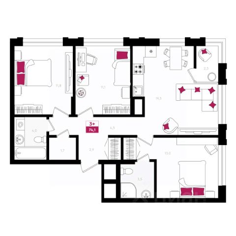 • ✓ В базе Циан 1 3-комнатных квартир на 13 этаже в микрорайоне Московский тракт в городе Тюмень