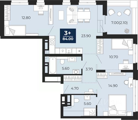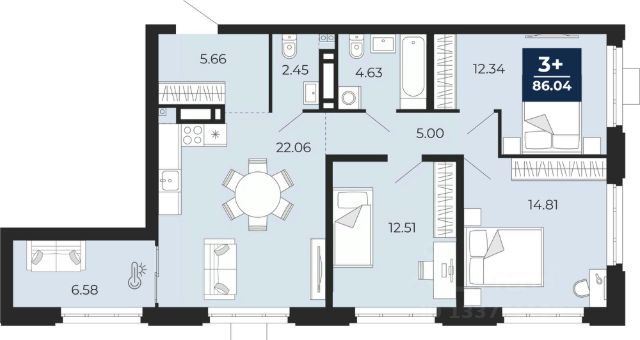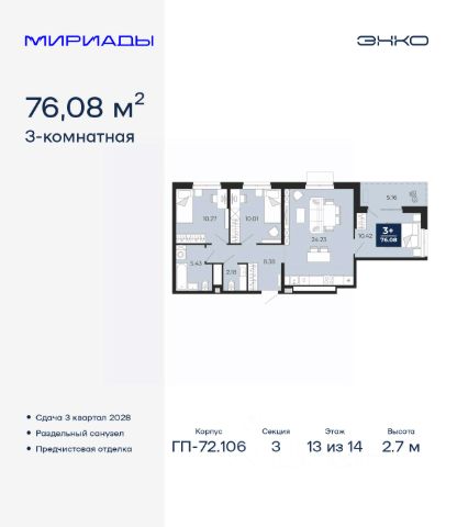 Трехкомнатная квартира от застройщика с предчистовой отделкой в ЖК "Дивный квартал у озера" на 13 этаже. Общая площадь: 82.1 кв.м., жилая: 45 кв.м., площадь просторной кухни-столовой: 20.2 кв.м. Квартира - распашонка, без проходных комнат, окна выходят на paзные стороны дома. В квартире один балкон, один раздельный санузел. Высота потолков 2.7 м.