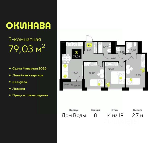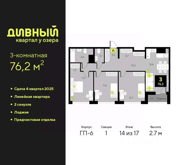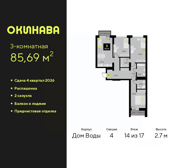 Просторная трехкомнатная квартира с предчистовой отделкой в ЖК "Айвазовский City" на 14 этаже. Общая площадь: 86.04 кв.м., жилая: 39.66 кв.м., площадь просторной кухни-столовой: 22.06 кв.м. Угловая квартира, очень светлая, естественная вентиляция при открытии окон. В квартире один совмещенный и один раздельный санузел. Высота потолков 2.7 м. Дом монолитный, многоподъездный, высотой 24 этажа. Квартира находится в 4-й секции в корпусе ГП-12. На этаже 5 квартир. В подъезде 1 пассажирский и 1 грузовой лифт. Окончание строительства - 4 квартал 2028 года. Оформление сделки по договору долевого участия. Новый жилой район располагается в живописном месте на берегу Туры в центральной части города. Принципиально новое пространство для жизни в центре современного города для тех, чьи мечты сбываются, кто нацелен на постоянный рост, перемены к лучшему для себя и своих близких. Каждая деталь Айвазовский City вдохновляет и заряжает на новые свершения: авторская архитектура, сбалансированная продуманная инфраструктура, дизайнерские дворы со спортивными и детскими площадками, парковые зоны с фонтанами, водный канал, украшающий центральный прогулочный маршрут района и многое другое. В 2019 года проект стал лауреатом престижной премии Urban Awards 2019 в номинации "Лучший строящийся региональный жилой комплекс бизнес-класса". Главная особенность Айвазовский City - соседство разных архитектурных школ в рамках одного дома. Изысканная классика, выразительная эклектика и оригинальный модерн - жить в одном из таких домов настоящий повод для гордости. Айвазовский City это идеальное сочетание комфорта, технологий и развитой инфраструктуры. Вход в подъезд возможен с улицы и со двора. Отправляясь на работу или за покупками, жители могут выйти с внешней стороны дома, а для прогулки с ребенком со стороны двора. Экологически чистые материалы и энергосберегающие технологии, качественное освещение общественных зон, видеонаблюдение по всей территории жилого района (в том числе в подъездах, лифтах и в подземном паркинге), закрытые дворы с доступом только для жителей Айвазовский City. Часть домов в Айвазовский City будут оснащены подземным паркингом. Востребованный в нашем климатическом поясе формат хранения автомобилей защитит собственность владельца в любое время года. Аккредитация в банках: ОАО "Альфа-Банк", "Сбербанк России", ПАО Банк "ВТБ", ПАО "Газпромбанк", ПАО "Совкомбанк" и других. #2mvAu7