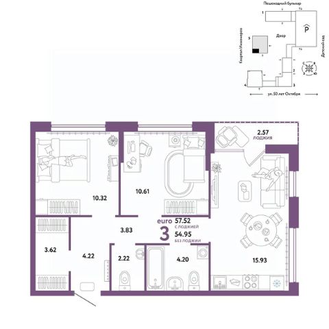 Квартира с кухней-гостиной и тремя спальнями в кварталах "На Минской". Особенности планировки: вид во двор, лоджия, разнесённые спальни, предчистовая отделка, мастер-спальня, постирочная, балкон.
