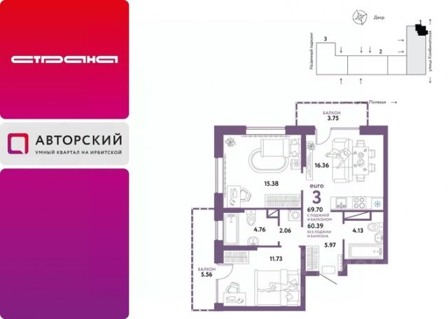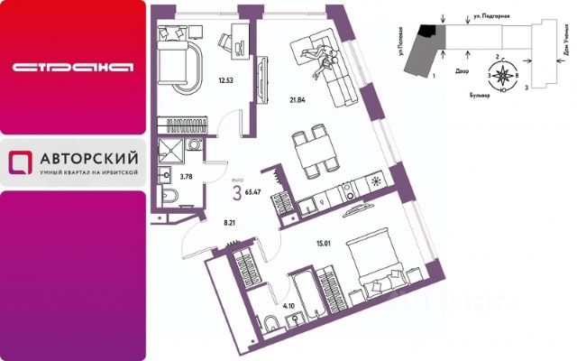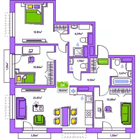 Квартира площадью 78 кв. м, кухня, и 3 изолированных комнаты. 2 сан узла, и гардеробная комната.
