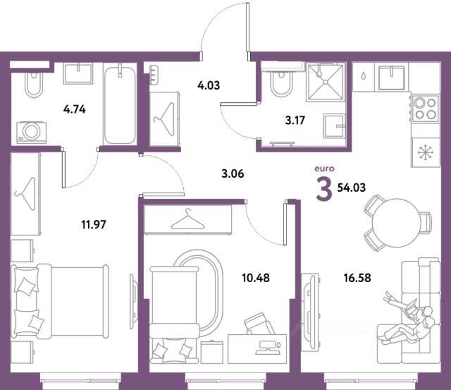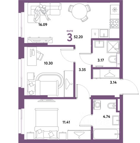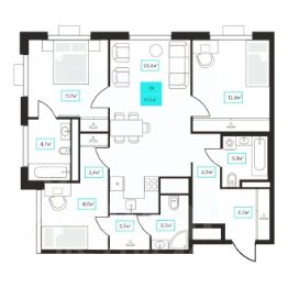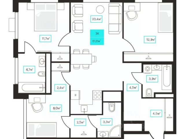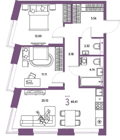 Просторная трешка с окнами на две стороны. В квартире просторная прихожая с нищами под вместительные шкафы для хранения. Две светлых спальни. Гостиная площадью более 20 м² с угловым остеклением, нишей для приготовления, обеденной и гостиной зонами, а также нишей для рабочего места.