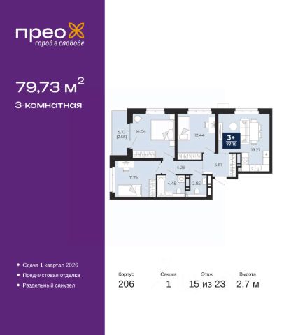 Спешите забронировать, пока действует скидка, предложение ограничено! Стоимость квартиры указана со скидкой, ваша экономия составит 500,000 руб. По всем вопросам обращайтесь в офис продаж, наши менеджеры вам все расскажут. Продается 3-комн. квартира от застройщика с предчистовой отделкой в ЖК "Прео" на 15 этаже. Общая площадь: 79.73 кв.м. Высота потолков 2.7 м. Дом монолитный, трехподъездный, переменной этажности, от 14 до 23 этажей. Квартира находится в 1-й секции высотой 23 этажа в корпусе 206. На этаже 8 квартир. В подъезде 1 пассажирский и 1 грузовой лифт. Окончание строительства - 1 квартал 2026 года. Оформление сделки по договору долевого участия. Преображенский — один из самых привлекательных районов для жизни! Это полностью самостоятельный жилой район с точки зрения инфраструктуры. Преображенский находится между Московским и Червишевским трактами в квартале улиц Закалужская — Вьюжная — Александра Протозанова. Не нужно ждать, когда появится инфраструктура — переезжайте на всё готовое. Вблизи расположены действующие школа и детский сад. В этом году откроется еще один сад, а в следующем году — школа. По соседству с Преображенским запланировано строительство городского парка "Комарово" площадью 38 гектар. За 10 минут можно доехать на автомобиле до крупных ТРЦ: "Лента", "Кристалл", "Леруа Мерлен", "Метро" и "Ашан". С 2018 года в районе открыт Соседский центр — пространство, созданное для формирования добрососедской среды, совместного досуга, общения и реализации соседских инициатив. Здесь проходят встречи соседей, а также сами жители района организовывают мероприятия. Организатором такого события может стать любой желающий. В квартирах выполнена качественная предчистовая отделка. Гладкие стены с финишным выравниванием по маякам. Ровный потолок для установки натяжного потолка. Установлены пятикамерные окна с двойным стеклопакетом (3 стекла). Дизайнерские холлы с видеонаблюдением, безбарьерным и прозрачным входом всегда светло и спокойно. На первом этаже есть просторные колясочные, где все жители могут оставлять свои коляски и велосипеды. В Преображенском есть всё, что нужно для активного отдыха и занятий спортом. Мы сделали большое футбольное поле с безопасным покрытием. Также установили хоккейный корт, который оборудован по всем необходимым стандартам. Во дворах можно делать упражнения на специальных площадках с турниками. Весь район мы обустроили велодорожками, которые связаны в единый маршрут. У нас есть сухие фонтаны, бьющие из земли, деревья, веревки, сетки, скалодром, газон, песок и резинка — осталось просто дать своему ребенку право на свободную игру. По-настоящему хорошие дворы — это те, которые дети предпочитают соцсетям и телевизору. Аккредитация в банках: ОАО "Альфа-Банк", ПАО "Банк Уралсиб", "Сбербанк России", ПАО "Газпромбанк", ПАО Банк "ВТБ" и других. #2mEICB