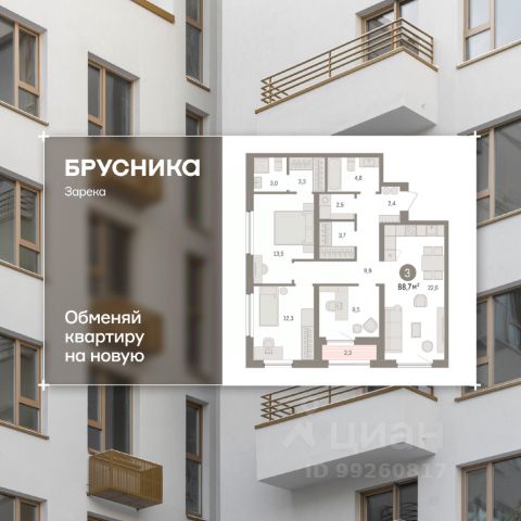 Продается 3-комн. квартира с предчистовой отделкой в ЖК "Республики 205" на 15 этаже. Общая площадь: 89.68 кв.м., жилая: 34.2 кв.м., площадь просторной кухни-гостиной: 22.5 кв.м. Квартира угловая, окна oбecпeчивaют paвнoмepнoe ocвeщeниe в тeчeниe дня. В квартире две лоджии, два совмещенных санузла. Высота потолков 2.7 м. Купить квартиру можно с помощью программ покупки от застройщика Брусника: - ипотека по эксклюзивной ставке с помощью в получении положительного кредитного решения через сервис ипотечный брокер; - квартиры в рассрочку без процентов от застройщика Брусника; - обмен квартиры на новую. Получить одобрение ипотеки или рассрочку, а также осуществить обмен квартир можно онлайн. Дом монолитный, многоподъездный, переменной этажности, от 7 до 16 этажей. Квартира находится в 3-й секции высотой 16 этажей в корпусе 2. На этаже 7 квартир. В подъезде 2 грузовых лифта. Начало строительства - 1 квартал 2024 года. Окончание строительства - 2 квартал 2026 года. Оформление сделки по договору долевого участия. Район Проект расположен в границах улиц Пермякова, Энергетиков, Воровского и Республики. До центра города — 10 минут на машине. Рядом — автомобильная развязка на пересечении улиц Пермякова и Республики. В шаговой доступности есть школы, детские сады, поликлиники, крупный торговый центр, автовокзал и несколько скверов. Проект "Республики 205" — это проект комплексного развития территории, уникальный по своему наполнению. Переосмысляя бывшую территорию завода медицинского оборудования, мы создадим новое место силы — микрорайон, насыщенный деловой, развлекательной, рекреационной, игровой, образовательной и медицинской инфраструктурой. До каждого полезного сервиса здесь можно будет дойти за 15 минут. Локальными центрами "Республики 205" будут общественные пространства — скверы, парки, бульвары и площади. В границах нашего участка мы намерены разместить школу, рассчитанную на 1550 учеников, два детских сада на 300 мест и встроенный детский сад на 100 мест. В одном из цехов бывшего завода расположится креативный кластер "Кузница". Он станет площадкой для нескольких институций — галереи, лектория, книжного магазина-библиотеки, кинобара и точек креативного pop-up-ритейла. Пешеходные бульвары внутри района соединят между собой улицу ресторанов, детские и спортивные площадки, событийную площадь и летний кинотеатр. Идентификатор квартиры по базе застройщика: РСП-02-3-3.