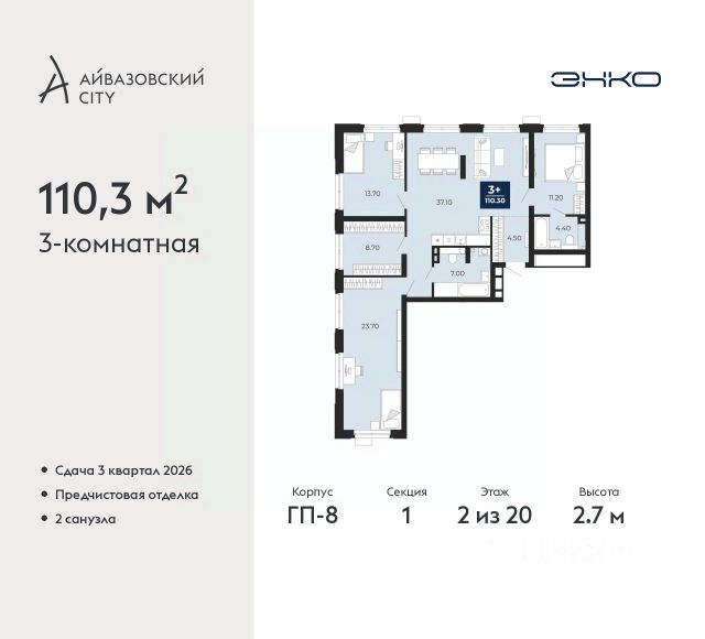 3-комн. квартира с предчистовой отделкой в ЖК "Айвазовский" на 2 этаже. Общая площадь: 100.67 кв.м., жилая: 45.6 кв.м., площадь просторной кухни-столовой: 27.59 кв.м. Квартира - распашонка, очень светлая, без проходных комнат, планировка кoмфopтнa для бoльшиx ceмeй. В квартире одна лоджия, два совмещенных и один раздельный санузел. Высота потолков 2.7 м. Дом монолитный, многоподъездный, высотой 24 этажа. Квартира находится в 3-й секции в корпусе ГП-12. На этаже 6 квартир. В подъезде 1 пассажирский и 1 грузовой лифт. Окончание строительства - 4 квартал 2028 года. Оформление сделки по договору долевого участия. Новый жилой район располагается в живописном месте на берегу Туры в центральной части города. Принципиально новое пространство для жизни в центре современного города для тех, чьи мечты сбываются, кто нацелен на постоянный рост, перемены к лучшему для себя и своих близких. Каждая деталь ЖК "Айвазовский" вдохновляет и заряжает на новые свершения: авторская архитектура, сбалансированная продуманная инфраструктура, дизайнерские дворы со спортивными и детскими площадками, парковые зоны с фонтанами, водный канал, украшающий центральный прогулочный маршрут района и многое другое. В 2019 года проект стал лауреатом престижной премии Urban Awards 2019 в номинации "Лучший строящийся региональный жилой комплекс бизнес-класса". Главная особенность Айвазовский - соседство разных архитектурных школ в рамках одного дома. Изысканная классика, выразительная эклектика и оригинальный модерн - жить в одном из таких домов настоящий повод для гордости. Айвазовский это идеальное сочетание комфорта, технологий и развитой инфраструктуры. Вход в подъезд возможен с улицы и со двора. Отправляясь на работу или за покупками, жители могут выйти с внешней стороны дома, а для прогулки с ребенком со стороны двора. Экологически чистые материалы и энергосберегающие технологии, качественное освещение общественных зон, видеонаблюдение по всей территории жилого района (в том числе в подъездах, лифтах и в подземном паркинге), закрытые дворы с доступом только для жителей Айвазовский. Часть домов в Айвазовский будут оснащены подземным паркингом. Востребованный в нашем климатическом поясе формат хранения автомобилей защитит собственность владельца в любое время года. Аккредитация в банках: ОАО "Альфа-Банк", ПАО Банк "ВТБ", "Сбербанк России", ПАО "Газпромбанк", АО "ДОМ.РФ" и других. #zMvAWI