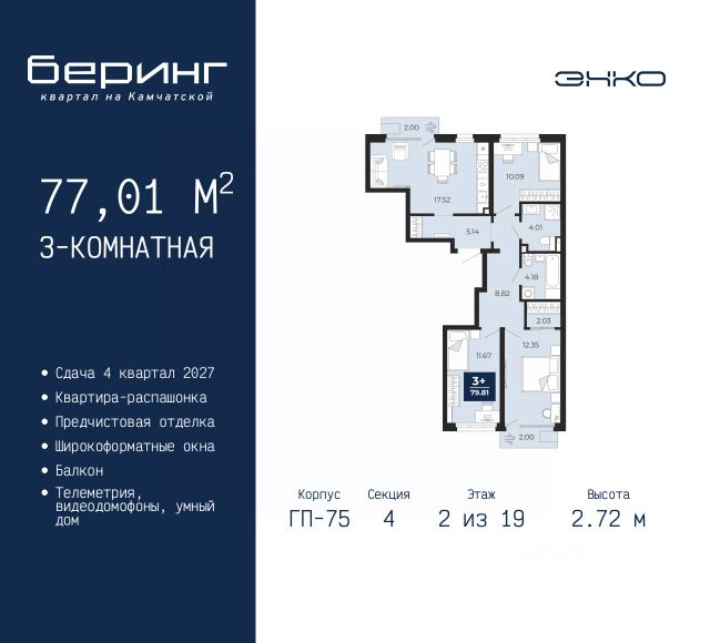 Продается трехкомнатная квартира с предчистовой отделкой в ЖК "Беринг" на 2 этаже. Общая площадь: 68.88 кв.м., жилая: 36.11 кв.м., площадь просторной кухни-столовой: 16.57 кв.м. Угловая квартира, очень светлая, естественная вентиляция при открытии окон. В квартире один балкон, два совмещенных санузла. Высота потолков 2.72 м. Дом монолитный, многоподъездный, переменной этажности, от 17 до 24 этажей. Квартира находится в 3-й секции высотой 24 этажа в корпусе ГП-75. На этаже 6 квартир. В подъезде 2 пассажирских и 1 грузовой лифт. Окончание строительства - 4 квартал 2027 года. Оформление сделки по договору долевого участия. Подобно знаменитому исследователю, мы чувствуем себя первооткрывателями этой локации. Хотим показать новую суть места, сформировать для вас жизненный опыт, которого ещё не было. Беринг — район зелёного цвета. Беринг — район, который откроется вам с другой стороны. Впечатлит новым уровнем комфорта и качеством жизни. Беринг — открытие на карте города. Первый квартал расположен в районе Тура, в границах улиц: Камчатская Западносибирская Энтузиастов. Вокруг уже есть всё для того, чтобы ежедневная рутина была лишь частью жизни и не доставляла дискомфорта. Школы и детские сады, магазины и аптеки, поликлиника, места для семейного отдыха, пеших и велопрогулок, и даже рыбалки. Масштабное озеленение дворов — визитная карточка ЭНКО и ваш оазис спокойствия, чтобы отвлечься от повседневности. Раскидистые деревья, кустарники, травы и цветы — осталось остановиться, вдохнуть и расслабиться, глядя на эту природную красоту. Стилистика подъездов продолжает концепцию Беринга, вдохновлённого Камчаткой: сдержанный, но при этом впечатляющий дизайн соседствует с удобством и функциональностью. #Zmg9d6
