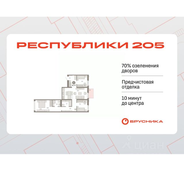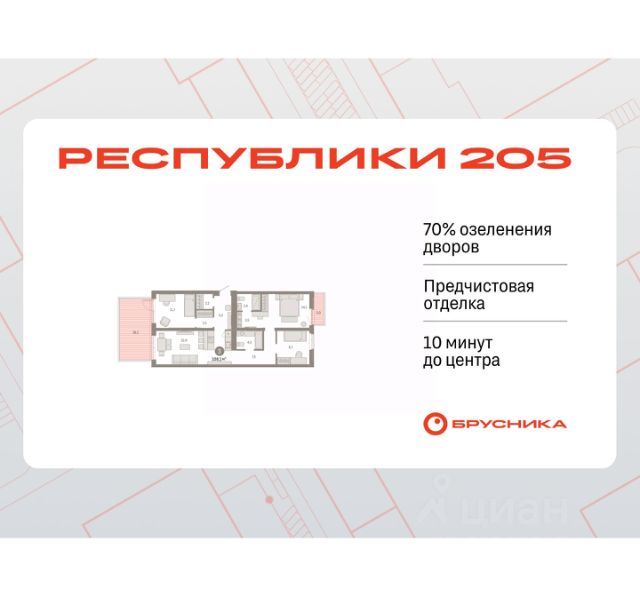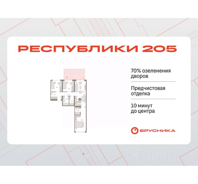 Квартира в счёт первоначального взноса по программе обмена. Звоните, наши менеджеры вам все расскажут! Просторная 3-комн. квартира с предчистовой отделкой в ЖК "Республики 205" на 2 этаже. Общая площадь: 109.05 кв.м. Высота потолков 2.7 м. Купить квартиру можно с помощью программ покупки от застройщика Брусника: - ипотека по эксклюзивной ставке с помощью в получении положительного кредитного решения через сервис ипотечный брокер; - квартиры в рассрочку без процентов от застройщика Брусника; - обмен квартиры на новую. Получить одобрение ипотеки или рассрочку, а также осуществить обмен квартир можно онлайн. Дом монолитный, многоподъездный, переменной этажности, от 7 до 25 этажей. Квартира находится в 7-й секции высотой 9 этажей в корпусе 3-1. На этаже 7 квартир. В подъезде 1 пассажирский и 1 грузовой лифт. Окончание строительства - 1 квартал 2027 года. Оформление сделки по договору долевого участия. Район Проект расположен в границах улиц Пермякова, Энергетиков, Воровского и Республики. До центра города — 10 минут на машине. Рядом — автомобильная развязка на пересечении улиц Пермякова и Республики. В шаговой доступности есть школы, детские сады, поликлиники, крупный торговый центр, автовокзал и несколько скверов. Проект "Республики 205" — это проект комплексного развития территории, уникальный по своему наполнению. Переосмысляя бывшую территорию завода медицинского оборудования, мы создадим новое место силы — микрорайон, насыщенный деловой, развлекательной, рекреационной, игровой, образовательной и медицинской инфраструктурой. До каждого полезного сервиса здесь можно будет дойти за 15 минут. Локальными центрами "Республики 205" будут общественные пространства — скверы, парки, бульвары и площади. В границах нашего участка мы намерены разместить школу, рассчитанную на 1550 учеников, два детских сада на 300 мест и встроенный детский сад на 100 мест. В одном из цехов бывшего завода расположится креативный кластер "Кузница". Он станет площадкой для нескольких институций — галереи, лектория, книжного магазина-библиотеки, кинобара и точек креативного pop-up-ритейла. Пешеходные бульвары внутри района соединят между собой улицу ресторанов, детские и спортивные площадки, событийную площадь и летний кинотеатр. Идентификатор квартиры по базе застройщика: РСП03. #zSZBF5