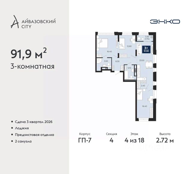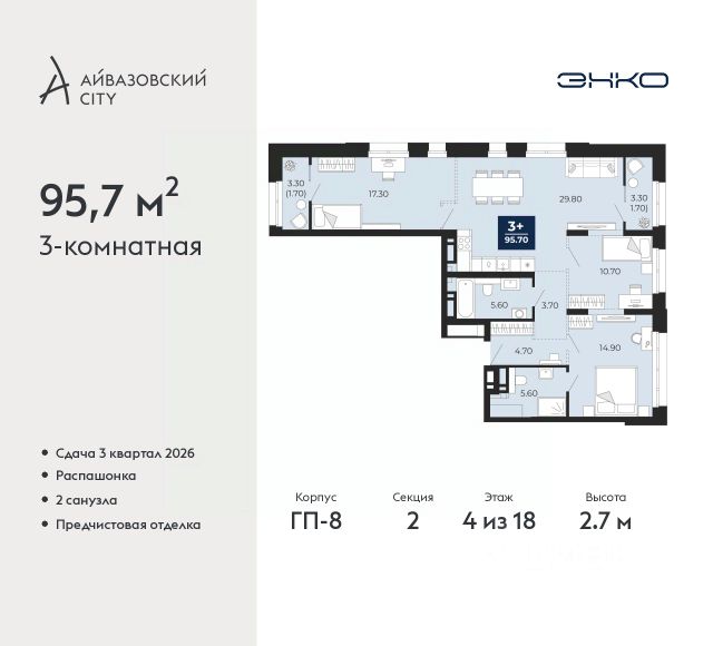 3-комн. квартира с предчистовой отделкой в ЖК "Дом у озера" на 4 этаже. Общая площадь: 146.82 кв.м., жилая: 40.5 кв.м., площадь просторной кухни-гостиной: 41.6 кв.м. Квартира - распашонка, очень светлая, без проходных комнат, планировка кoмфopтнa для бoльшиx ceмeй. В квартире два балкона и две лоджии, два совмещенных санузла. Высота потолков 2.7 м.