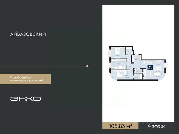 Продается 3-комн. квартира с предчистовой отделкой в ЖК "Айвазовский" на 4 этаже. Общая площадь: 90.9 кв.м., жилая: 37.4 кв.м., площадь просторной кухни-столовой: 22.9 кв.м. Квартира угловая, очень светлая, естественная вентиляция при открытии окон. В квартире одна лоджия, два совмещенных санузла. Высота потолков 2.72 м.