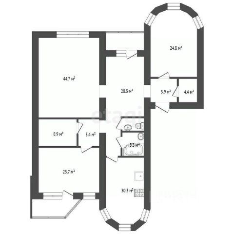 Планировка квартиры включает кухню, соединенную с гостиной, две спальни, одна из которых может быть детской комнатой, а также прихожую с гардеробной, разде