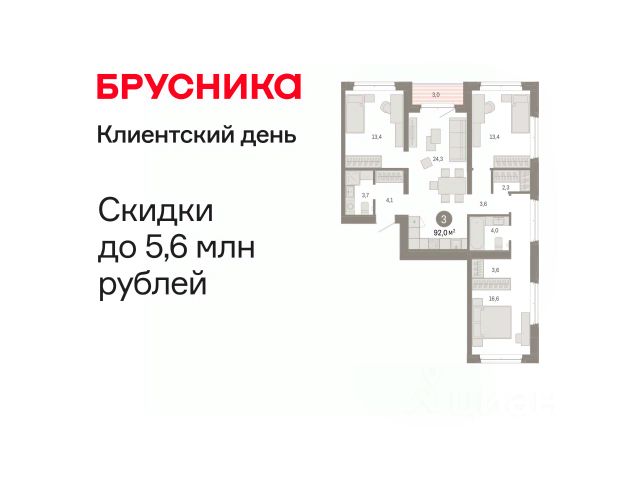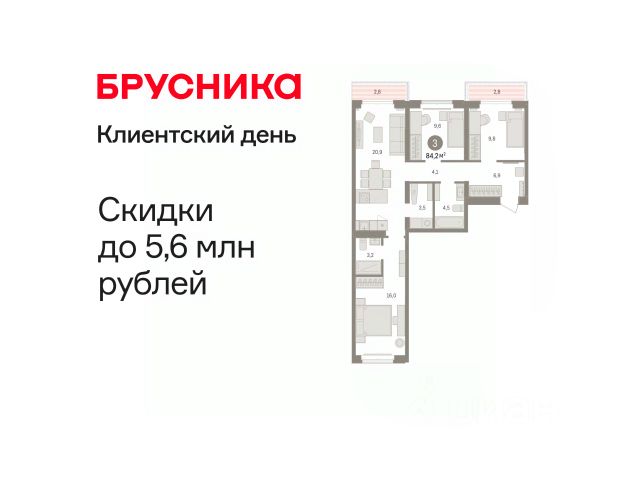 Квартира с кухней-гостиной и тремя спальнями в кварталах "На Минской". Особенности планировки: балкон, вид во двор, мастер-спальня, окна на две стороны, постирочная, предчистовая отделка, разнесённые спальни.
