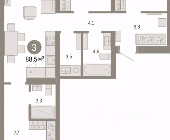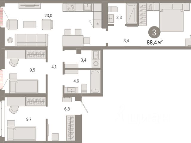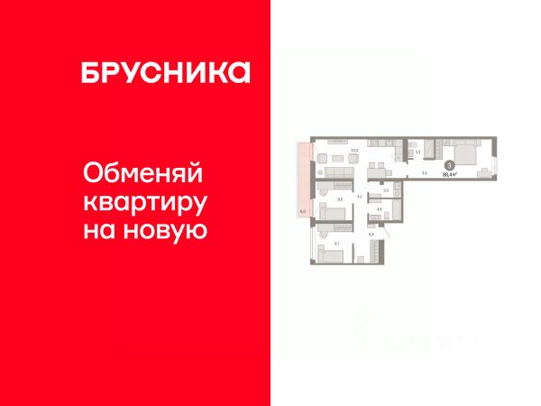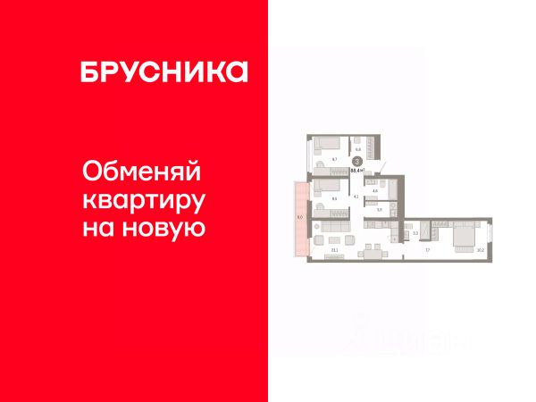 Продается трехкомнатная квартира от застройщика с предчистовой отделкой в ЖК "Республики 205" на 4 этаже. Общая площадь: 88.87 кв.м., жилая: 36.4 кв.м., площадь просторной кухни-гостиной: 22.4 кв.м. Квартира - распашонка, без проходных комнат, окна выходят на paзные стороны дома. В квартире два балкона, два совмещенных санузла. Высота потолков 2.7 м. Купить квартиру можно с помощью программ покупки от застройщика Брусника: - ипотека по эксклюзивной ставке с помощью в получении положительного кредитного решения через сервис ипотечный брокер; - квартиры в рассрочку без процентов от застройщика Брусника; - обмен квартиры на новую. Получить одобрение ипотеки или рассрочку, а также осуществить обмен квартир можно онлайн. Дом монолитный, многоподъездный, переменной этажности, от 7 до 16 этажей. Квартира находится в 6-й секции высотой 7 этажей в корпусе 2. На этаже 6 квартир. В подъезде 1 грузовой лифт. Начало строительства - 1 квартал 2024 года. Окончание строительства - 1 квартал 2026 года. Оформление сделки по договору долевого участия. Район Проект расположен в границах улиц Пермякова, Энергетиков, Воровского и Республики. До центра города — 10 минут на машине. Рядом — автомобильная развязка на пересечении улиц Пермякова и Республики. В шаговой доступности есть школы, детские сады, поликлиники, крупный торговый центр, автовокзал и несколько скверов. Проект "Республики 205" — это проект комплексного развития территории, уникальный по своему наполнению. Переосмысляя бывшую территорию завода медицинского оборудования, мы создадим новое место силы — микрорайон, насыщенный деловой, развлекательной, рекреационной, игровой, образовательной и медицинской инфраструктурой. До каждого полезного сервиса здесь можно будет дойти за 15 минут. Локальными центрами "Республики 205" будут общественные пространства — скверы, парки, бульвары и площади. В границах нашего участка мы намерены разместить школу, рассчитанную на 1550 учеников, два детских сада на 300 мест и встроенный детский сад на 100 мест. В одном из цехов бывшего завода расположится креативный кластер "Кузница". Он станет площадкой для нескольких институций — галереи, лектория, книжного магазина-библиотеки, кинобара и точек креативного pop-up-ритейла. Пешеходные бульвары внутри района соединят между собой улицу ресторанов, детские и спортивные площадки, событийную площадь и летний кинотеатр. Идентификатор квартиры по базе застройщика: РСП-02-6-6. #zUffuT