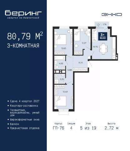 Квартира с кухней-гостиной и тремя спальнями в кварталах "На Минской". Особенности планировки: балкон, предчистовая отделка, разнесённые спальни.