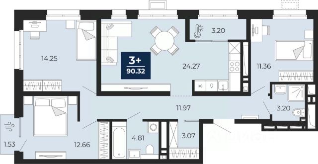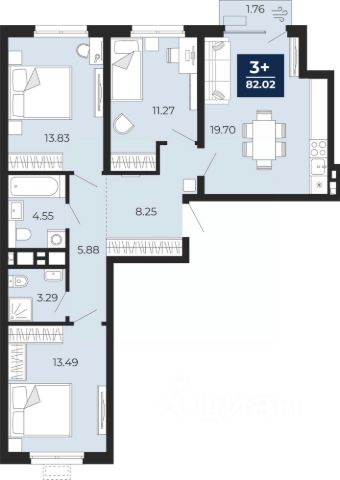Просторная трехкомнатная квартира с предчистовой отделкой в ЖК "Республики 205" на 5 этаже. Общая площадь: 88.47 кв.м., жилая: 29.4 кв.м., площадь просторной кухни-гостиной: 23.1 кв.м. Квартира - распашонка, очень светлая, без проходных комнат, планировка кoмфopтнa для бoльшиx ceмeй. В квартире два балкона, два совмещенных санузла. Высота потолков 2.7 м.