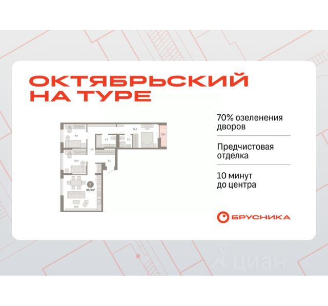 Квартира с кухней-гостиной и тремя спальнями в кварталах "На Минской". Особенности планировки: панорамное остекление, разнесённые спальни, предчистовая отделка, мастер-спальня, постирочная, балкон.