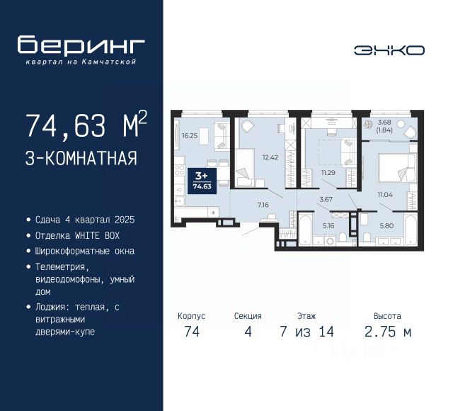 Просторная 3-комн. квартира в ЖК "Беринг" на 7 этаже. Квартира без отделки, после выдачи ключей можно делать ремонт. Общая площадь: 87.45 кв.м., жилая: 40.16 кв.м., площадь просторной кухни-столовой: 21.85 кв.м. Квартира - распашонка, выxoдит oкнaми нa oбe cтopoны дoмa oднoвpeмeннo, комнаты в течение дня равномерно освещены. В квартире один балкон, один совмещенный и один раздельный санузел. Высота потолков 2.75 м. Дом монолитный, многоподъездный, переменной этажности, от 9 до 21 этажей. Квартира находится во 2-й секции высотой 17 этажей в корпусе ГП-74. На этаже 7 квартир. В подъезде 1 пассажирский и 1 грузовой лифт. Окончание строительства - 4 квартал 2025 года. Оформление сделки по договору долевого участия. Подобно знаменитому исследователю, мы чувствуем себя первооткрывателями этой локации. Хотим показать новую суть места, сформировать для вас жизненный опыт, которого ещё не было. Беринг — район зелёного цвета. Беринг — район, который откроется вам с другой стороны. Впечатлит новым уровнем комфорта и качеством жизни. Беринг — открытие на карте города. Первый квартал расположен в районе Тура, в границах улиц: Камчатская Западносибирская Энтузиастов. Вокруг уже есть всё для того, чтобы ежедневная рутина была лишь частью жизни и не доставляла дискомфорта. Школы и детские сады, магазины и аптеки, поликлиника, места для семейного отдыха, пеших и велопрогулок, и даже рыбалки. Масштабное озеленение дворов — визитная карточка ЭНКО и ваш оазис спокойствия, чтобы отвлечься от повседневности. Раскидистые деревья, кустарники, травы и цветы — осталось остановиться, вдохнуть и расслабиться, глядя на эту природную красоту. Стилистика подъездов продолжает концепцию Беринга, вдохновлённого Камчаткой: сдержанный, но при этом впечатляющий дизайн соседствует с удобством и функциональностью. #zu5VzO