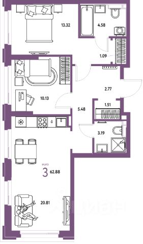 Представляем вам 3х комнатную квартиру с кухней-гостиной в жилом комплексе Новин. Просторная кухня гостиная, 2 спальные зоны, мастерская (можно под детскую), в коридоре 3 функциональных встроенных шкафа (1-входная зона, 2-обувной шкаф, 3-шкаф для хранения полотенец, постельного белья, пледов, подушек и т.д.), 2 санузла. Три окна выходят во двор, одно окно на другую сторону. В квартире установлены датчики теплого пола, кондиционер, счетчики на холодную и горячую воду, электроснабжение, отопление, система телеметрии - передача данных по потреблению воды, электричества, отопления автоматически передаются в управляющую компанию.
