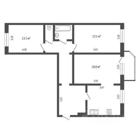 Три комнаты: 20, 17,5 и 13,3 м²,