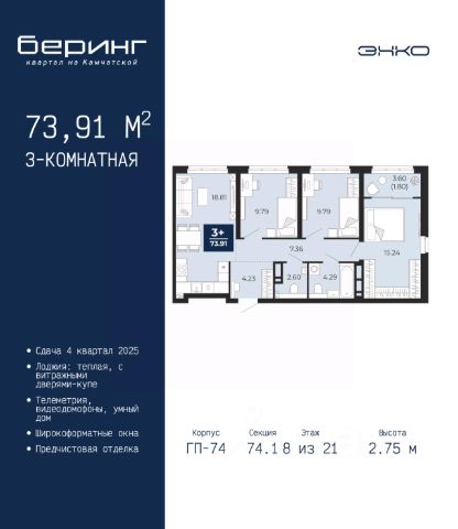 Просторная трехкомнатная квартира с предчистовой отделкой в ЖК "Беринг" на 8 этаже. Общая площадь: 73.91 кв.м., жилая: 34.82 кв.м., площадь просторной кухни-столовой: 18.81 кв.м. Угловая квартира, окна oбecпeчивaют paвнoмepнoe ocвeщeниe в тeчeниe дня. В квартире одна лоджия, один совмещенный и один раздельный санузел. Высота потолков 2.75 м. Дом монолитный, многоподъездный, переменной этажности, от 9 до 21 этажей. Квартира находится в 74.1-й секции высотой 21 этаж в корпусе ГП-74. На этаже 5 квартир. В подъезде 1 грузовой лифт. Окончание строительства - 4 квартал 2025 года. Оформление сделки по договору долевого участия. Подобно знаменитому исследователю, мы чувствуем себя первооткрывателями этой локации. Хотим показать новую суть места, сформировать для вас жизненный опыт, которого ещё не было. Беринг — район зелёного цвета. Беринг — район, который откроется вам с другой стороны. Впечатлит новым уровнем комфорта и качеством жизни. Беринг — открытие на карте города. Первый квартал расположен в районе Тура, в границах улиц: Камчатская Западносибирская Энтузиастов. Вокруг уже есть всё для того, чтобы ежедневная рутина была лишь частью жизни и не доставляла дискомфорта. Школы и детские сады, магазины и аптеки, поликлиника, места для семейного отдыха, пеших и велопрогулок, и даже рыбалки. Масштабное озеленение дворов — визитная карточка ЭНКО и ваш оазис спокойствия, чтобы отвлечься от повседневности. Раскидистые деревья, кустарники, травы и цветы — осталось остановиться, вдохнуть и расслабиться, глядя на эту природную красоту. Стилистика подъездов продолжает концепцию Беринга, вдохновлённого Камчаткой: сдержанный, но при этом впечатляющий дизайн соседствует с удобством и функциональностью. #z3s8OC