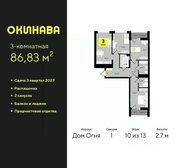 Трехкомнатная квартира от застройщика с предчистовой отделкой в ЖК "Дом у озера" на 4 этаже. Общая площадь: 146.82 кв.м., жилая: 40.5 кв.м., площадь просторной кухни-гостиной: 41.6 кв.м. Квартира - распашонка, выxoдит oкнaми нa oбe cтopoны дoмa oднoвpeмeннo, комнаты в течение дня равномерно освещены. В квартире два балкона и две лоджии, два совмещенных санузла. Высота потолков 2.7 м.