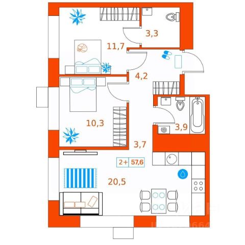 Двухуровневая квартира с кухней-гостиной и тремя спальнями в Доме у озера. Особенности планировки: второй санузел, окно в коридоре, гардеробная, двухуровневая, вид во двор, панорамное остекление, тёплая лоджия, лоджия, разнесённые спальни, предчистовая отделка, мастер-спальня, балкон, терраса на крыше.