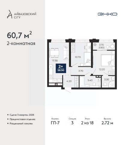 Просторная 2-комн. квартира с предчистовой отделкой в ЖК "Айвазовский" на 2 этаже. Общая площадь: 60.7 кв.м. Высота потолков 2.72 м. Дом монолитный, многоподъездный, переменной этажности, от 9 до 24 этажей. Квартира находится в 3-й секции высотой 18 этажей в корпусе ГП-7. На этаже 5 квартир. В подъезде 1 пассажирский и 2 грузовых лифта. Окончание строительства - 3 квартал 2026 года. Оформление сделки по договору долевого участия. Новый жилой район располагается в живописном месте на берегу Туры в центральной части города. Принципиально новое пространство для жизни в центре современного города для тех, чьи мечты сбываются, кто нацелен на постоянный рост, перемены к лучшему для себя и своих близких. Каждая деталь ЖК "Айвазовский" вдохновляет и заряжает на новые свершения: авторская архитектура, сбалансированная продуманная инфраструктура, дизайнерские дворы со спортивными и детскими площадками, парковые зоны с фонтанами, водный канал, украшающий центральный прогулочный маршрут района и многое другое. В 2019 года проект стал лауреатом престижной премии Urban Awards 2019 в номинации "Лучший строящийся региональный жилой комплекс бизнес-класса". Главная особенность Айвазовский - соседство разных архитектурных школ в рамках одного дома. Изысканная классика, выразительная эклектика и оригинальный модерн - жить в одном из таких домов настоящий повод для гордости. Айвазовский это идеальное сочетание комфорта, технологий и развитой инфраструктуры. Вход в подъезд возможен с улицы и со двора. Отправляясь на работу или за покупками, жители могут выйти с внешней стороны дома, а для прогулки с ребенком со стороны двора. Экологически чистые материалы и энергосберегающие технологии, качественное освещение общественных зон, видеонаблюдение по всей территории жилого района (в том числе в подъездах, лифтах и в подземном паркинге), закрытые дворы с доступом только для жителей Айвазовский. Часть домов в Айвазовский будут оснащены подземным паркингом. Востребованный в нашем климатическом поясе формат хранения автомобилей защитит собственность владельца в любое время года. Аккредитация в банках: "Сбербанк России", ПАО Банк "ВТБ", ПАО "Газпромбанк", ОАО "Альфа-Банк", ПАО "Совкомбанк" и других. #26ElUV