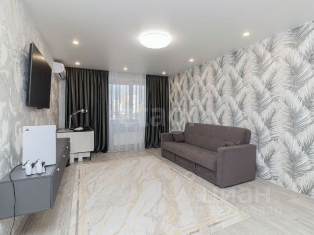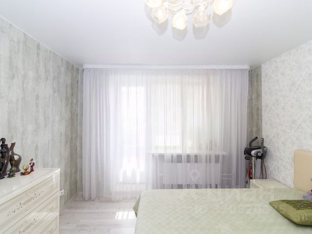 В гостиной расположен кожаный раскладной диван, кожаное кресло, тюль и плотные шторы. В спальной комнате двуспальная кровать с матрацем и наматрасником, прикроватная тумбочка, удобный и вместительный встроенный трехдверный шкаф, на окнах рулонные шторы (блекаут, т.к. солнечная сторона), тюль и плотные шторы, на полу постелен ковролин, установлен кондиционер.
