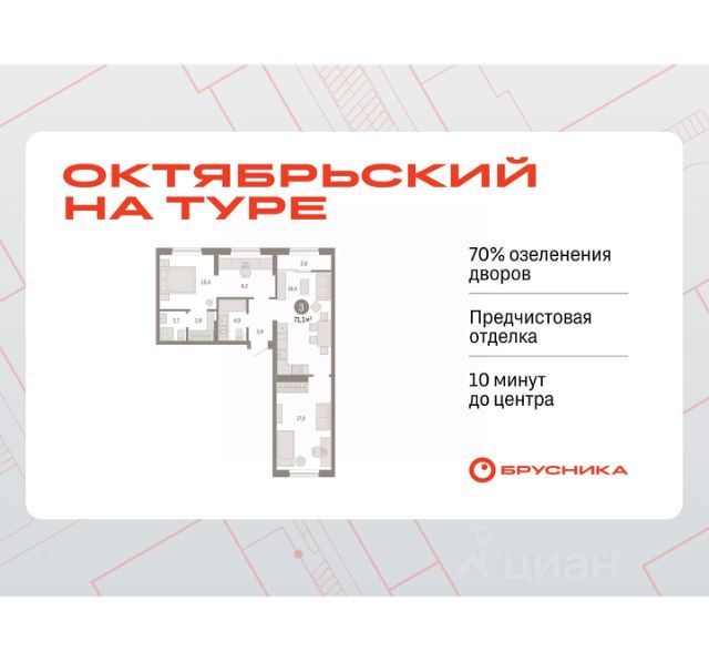 Квартира в счёт первоначального взноса по программе обмена. Квартира с кухней-гостиной и тремя спальнями в Октябрьском на Туре. Особенности планировки: рабочий кабинет, вид во двор, тёплая лоджия, разнесённые спальни, предчистовая отделка, мастер-спальня. квартиры в нашей базе: ОКТ-08-1-1.9.1. Район Проект расположен на берегу реки, в одном из самых живописных и экологичных районов Тюмени. За последние годы облик района изменился. По соседству с индивидуальной застройкой выросли многоквартирные дома. При проектировании "Октябрьского на Туре" нашей приоритетной задачей стало сохранение природного ландшафта: мы постарались деликатно вписать в него современную архитектуру. Квартал удачно расположен с точки зрения дорожной инфраструктуры. На автомобиле путь до центра города составит 15 минут. Добраться до набережной и главных тюменских достопримечательностей можно и на общественном транспорте. В пешей доступности находится автобусная остановка. Проект По мастер-плану здесь будет восемь домов. Ядро застройки составляют замкнутые кварталы переменной этажности. Их высотность понижается по мере приближения к реке. На углах участка мы разместили башни-доминанты. Одной из достопримечательностей квартала станет парк на Туре — здесь появится зеленая зона протяженностью около 6 километров для пеших и велопрогулок. Смысловая ось квартала — широкая главная улица с высаженными вдоль неё высокими деревьями. Они создают тень и работают как шумо- и пылезащитные экраны. Это место сосредоточения основных пешеходных и транспортных потоков, на сторону которых мы ориентировали большинство коммерческих помещений. Отсюда жители могут свернуть на тихие соседские улицы и попасть на внутриквартальную площадь — ещё одну точку притяжения.Квартира в счёт первоначального взноса по программе обмена. #ZMZBfd