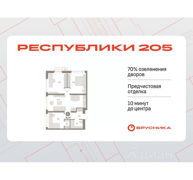 Квартира в рассрочку без процентов от застройщика. Эксклюзивные ипотечные условия. Обмен квартиры на новую. Предложение от застройщика. Дом будет сдан в 4 квартале 2025 года. Квартира в счёт первоначального взноса по программе обмена. По всем вопросам звоните в офис продаж, мы вам все подробно расскажем! 3-комн. квартира с предчистовой отделкой в ЖК "Республики 205" на 9 этаже. Общая площадь: 78.41 кв.м., жилая: 37.4 кв.м., площадь просторной кухни-гостиной: 18.6 кв.м. Квартира - распашонка, без проходных комнат, окна выходят на paзные стороны дома. В квартире один балкон и одна лоджия, один совмещенный и один раздельный санузел. Высота потолков 2.6 м. Купить квартиру можно с помощью программ покупки от застройщика Брусника: - ипотека по эксклюзивной ставке с помощью в получении положительного кредитного решения через сервис ипотечный брокер; - квартиры в рассрочку без процентов от застройщика Брусника; - обмен квартиры на новую. Получить одобрение ипотеки или рассрочку, а также осуществить обмен квартир можно онлайн. Дом монолитный, многоподъездный, переменной этажности, от 9 до 17 этажей. Квартира находится во 2-й секции высотой 9 этажей в корпусе 1. На этаже 6 квартир. В подъезде 1 грузовой лифт. Начало строительства - 2 квартал 2023 года. Окончание строительства - 4 квартал 2025 года. Оформление сделки по договору долевого участия. Район Проект расположен в границах улиц Пермякова, Энергетиков, Воровского и Республики. До центра города — 10 минут на машине. Рядом — автомобильная развязка на пересечении улиц Пермякова и Республики. В шаговой доступности есть школы, детские сады, поликлиники, крупный торговый центр, автовокзал и несколько скверов. Проект "Республики 205" — это проект комплексного развития территории, уникальный по своему наполнению. Переосмысляя бывшую территорию завода медицинского оборудования, мы создадим новое место силы — микрорайон, насыщенный деловой, развлекательной, рекреационной, игровой, образовательной и медицинской инфраструктурой. До каждого полезного сервиса здесь можно будет дойти за 15 минут. Локальными центрами "Республики 205" будут общественные пространства — скверы, парки, бульвары и площади. В границах нашего участка мы намерены разместить школу, рассчитанную на 1550 учеников, два детских сада на 300 мест и встроенный детский сад на 100 мест. В одном из цехов бывшего завода расположится креативный кластер "Кузница". Он станет площадкой для нескольких институций — галереи, лектория, книжного магазина-библиотеки, кинобара и точек креативного pop-up-ритейла. Пешеходные бульвары внутри района соединят между собой улицу ресторанов, детские и спортивные площадки, событийную площадь и летний кинотеатр. Идентификатор квартиры по базе застройщика: МЕД01-01-2-2. #ZMWbD4