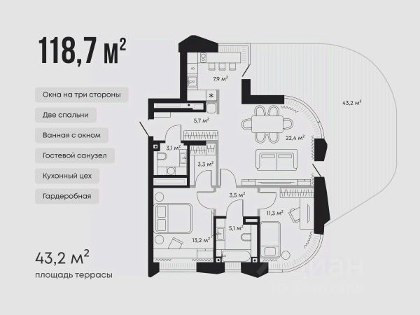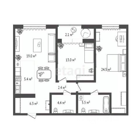 - 3 изолированные комнаты (.17.4м2 +.23.7м2+ 14.1м2 )