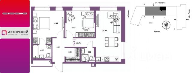 Новая квартира в ЖК "Авторский" напрямую от федерального застройщика "Страна Девелопмент". Продается 3комнатная квартира на 10 этаже от застройщика Страна Девелопмент. Площадь квартиры 65,74 кв. м. Жилой комплекс "Авторский" — квартал для авторов своей жизни от федерального застройщика "Страна Девелопмент" вблизи исторического центра — до Моста Влюблённых 4 минуты на авто, а ещё рядом ведущие вузы Тюмени. ПРЕИМУЩЕСТВА - Тематический бульвар объединяет дома и закрытые дворы квартала в единую экосистему: зелень, перголы для отдыха, детские и спортивные площадки. По вечерам бульвар преображается: освещение создаёт уютную атмосферу. - Новый детский сад рядом, который появится в 2026 году прямо в одном из корпусов комплекса. В нём выделено 150 мест для малышей. - Во дворах нет машин, шума, выхлопных газов и посторонних людей. Всё пространство разделено на зоны по интересам и возрастам. Для детей — игровые площадки из эко-материалов и мягкая защита от падений. Для взрослых — зоны отдыха, воркаут-площадки и тропинки для неспешных прогулок. ОТДЕЛКА Квартиры сдаются с предчистовой отделкой: произведена разводка электричества и отопления, выполнена стяжка пола, стены выровнены "под маяк", установлены розетки, выключатели и радиаторы. ДИЗАЙНЕРСКАЯ ОТДЕЛКА При покупке квартиры в ЖК "Авторский" можно включить стоимость ремонта в ипотеку. Пять вариантов на выбор: хлопковая нить, серый шторм, белый камень, шалфей, голубой вереск. СПОСОБЫ ПОКУПКИ Сотрудники "Страна Девелопмент" будут сопровождать вас на каждом этапе сделки, помогут получить одобрение по ипотеке или снизить ежемесячный платеж. - ипотека - рассрочка - с использованием материнского капитала -100% оплата наличными Цены на квартиры указаны без учета скидок. На консультации менеджер подскажет, какие акции действуют, и как получить одобрение по ипотеке с низкой ставкой.