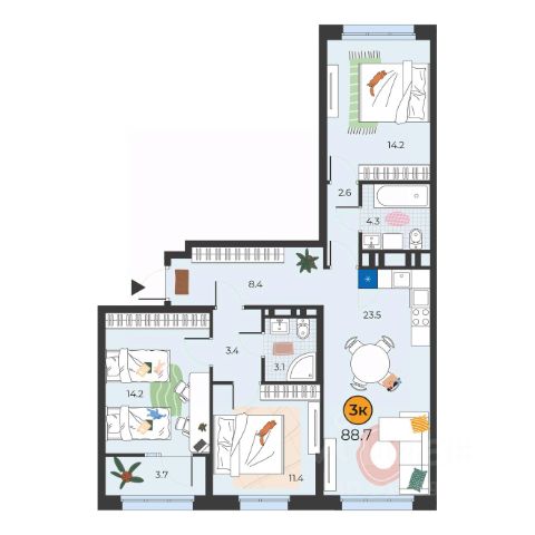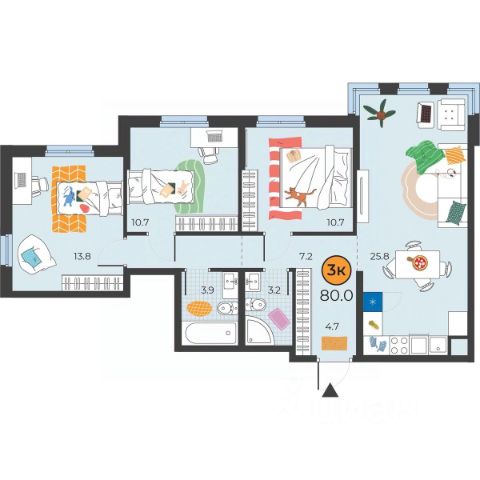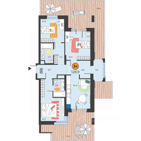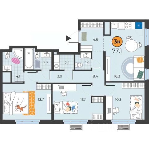 В квартире три комнаты площадью 15-19-19 кв.м., кухня-гостиная 15 кв.м., два балкона по 3 кв.м., раздельный санузел.